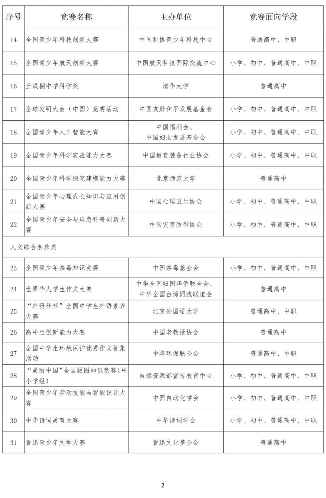 人文综合素养类竞赛活动包括全国青少年禁毒知识竞赛、世界华人学生作文大赛、“外研社杯”全国中学生外语素养大赛、高中生创新能力大赛等12项;