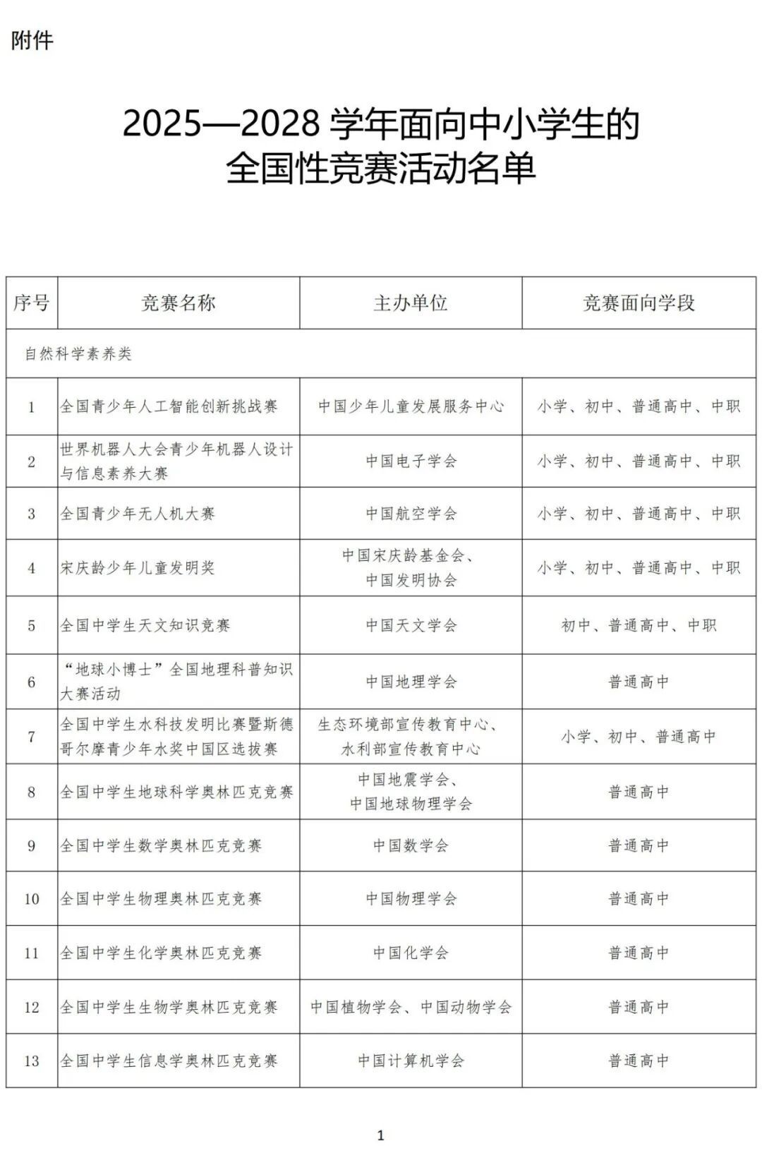 教育部要求,2025—2028学年面向中小学生开展的全国性竞赛活动举办时间原则上为2025年9月至2028年8月,在此期间每学年举办不得超过1次,累计不超过3次。
