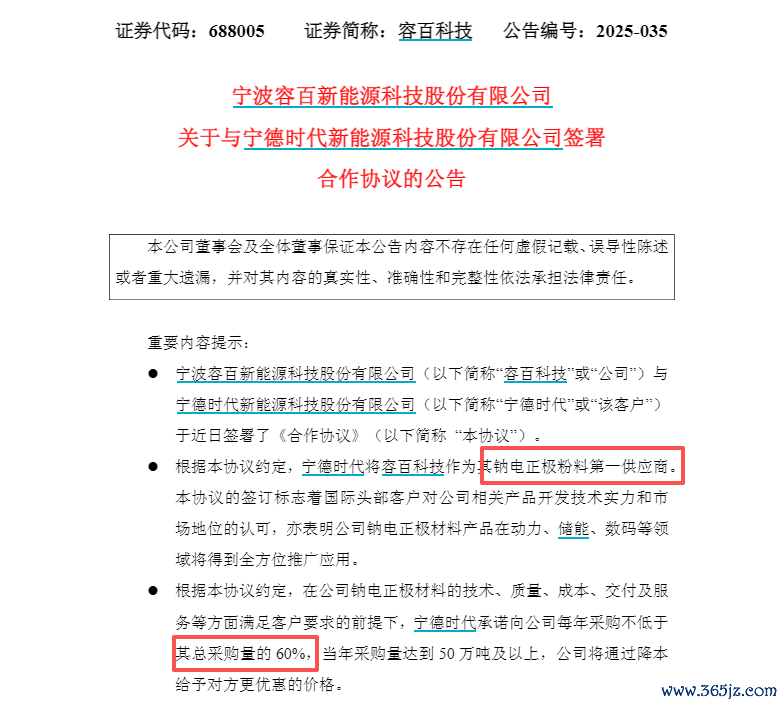 值得注意的是,11月16日晚间,容百科技公告,公司于近日与新能源巨头宁德时代签署了《合作协议》。根据协议,宁德时代将容百科技锁定为其“钠电正极粉料第一供应商”,宁德时代承诺,在容百科技满足相关要求的前提下,每年采购量不低于其总采购量的60%。