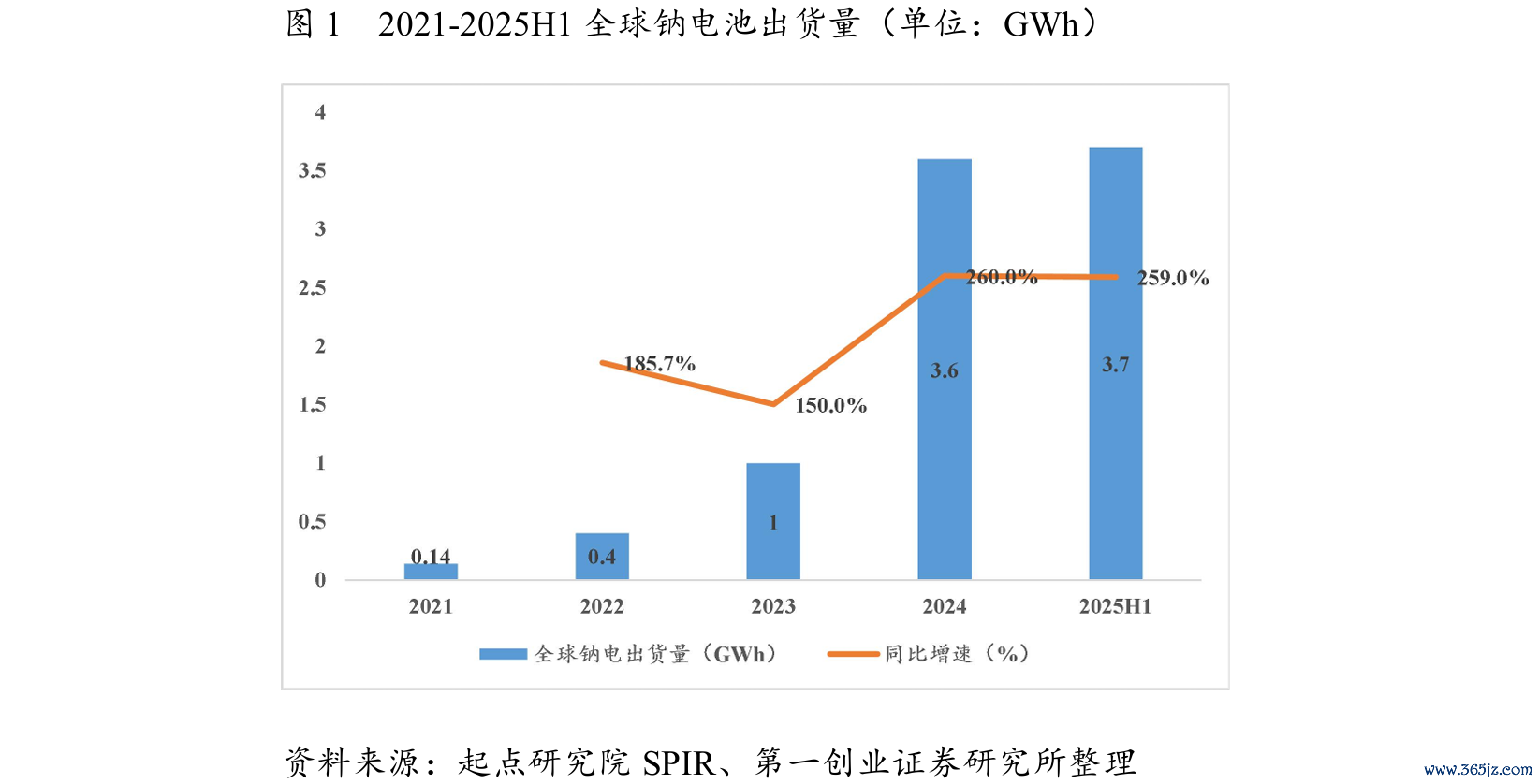 按起点研究院SPIR的统计,2025H1全球钠电池出货量达到3.7GWh,同比增长259.0%;预计2025年全年出货量有望超过23.1GWh,同比增幅达到542.7%。2021年到2024年全球钠电池出货量的复合年均增长率达195.2%。