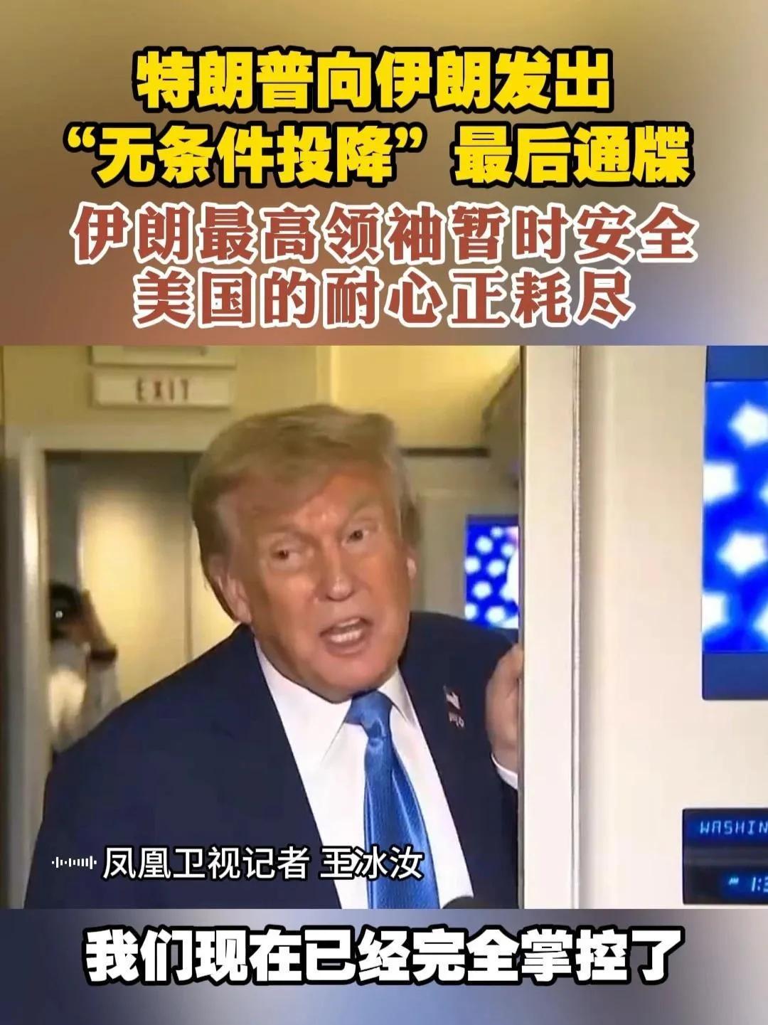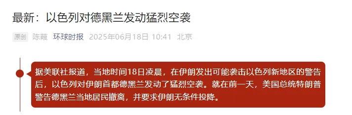 特朗普在昨天连续发帖说“德黑兰当地居民马上离开”“我们的耐心已经耗尽”要求伊朗“无条件投降”,“我们确切地知道伊朗最高领袖(哈梅内伊)的藏身之处。最高领袖是一个容易攻击的目标,我们不会除掉他,至少现在不会。”
