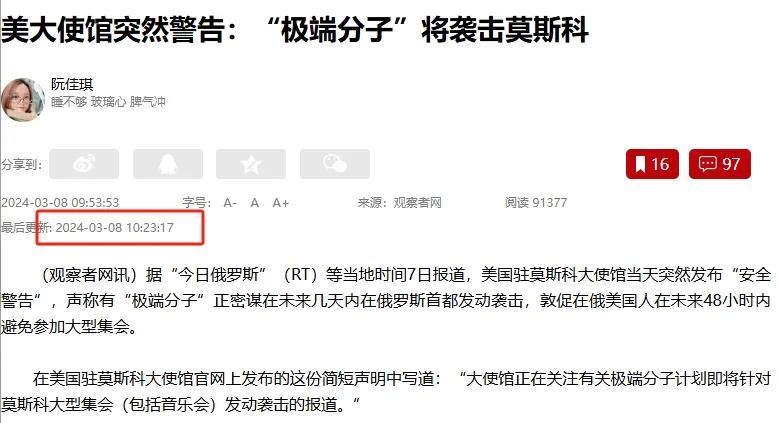 另一个例子是在2024年3月8日,美国驻莫斯科大使馆突然发出安全警告,声称有极端分子正在密谋未来几天内在俄罗斯首都发动袭击,敦促在俄美国人在未来几天内不要参加大型集会。