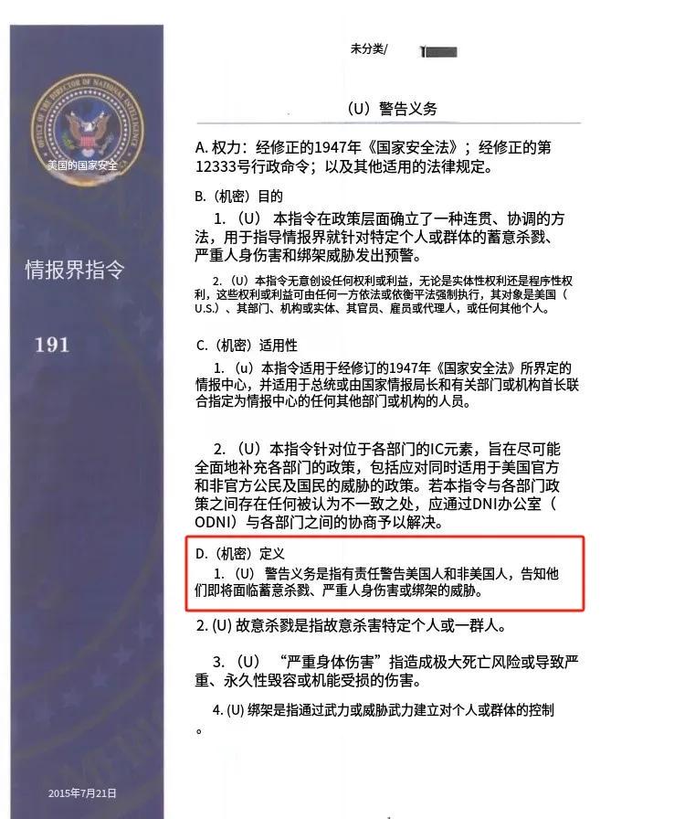 我在以前的文章里讲过,美国的情报界是有“警告义务”要求的,也就是说,2015年开始美国正式规定,美国情报机构“有义务警告”美国人和非美国人,他们即将遭遇袭击。