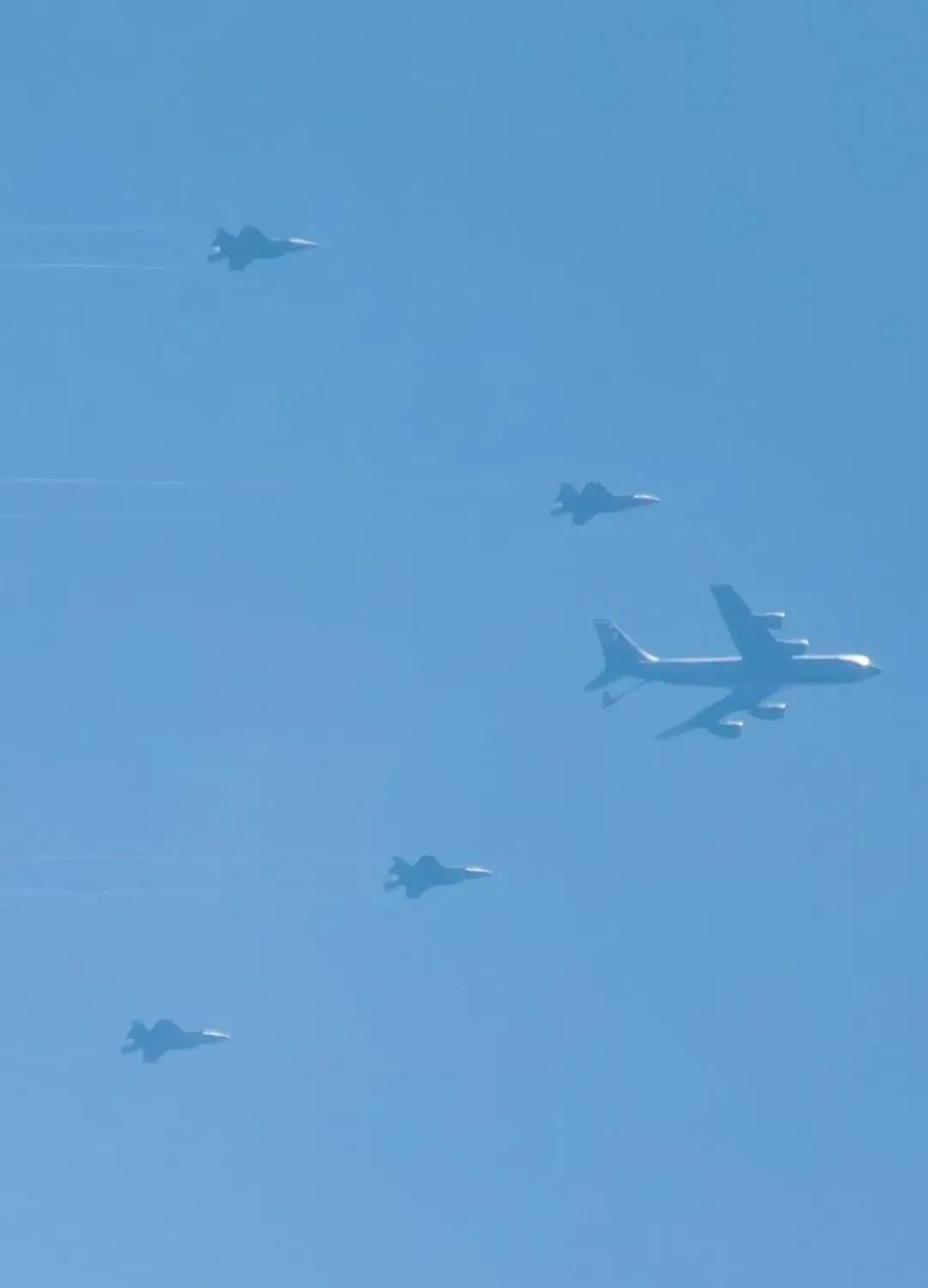 ▲有人拍到大量美国战斗机在加油机的支持下从欧洲离开,飞往中东
